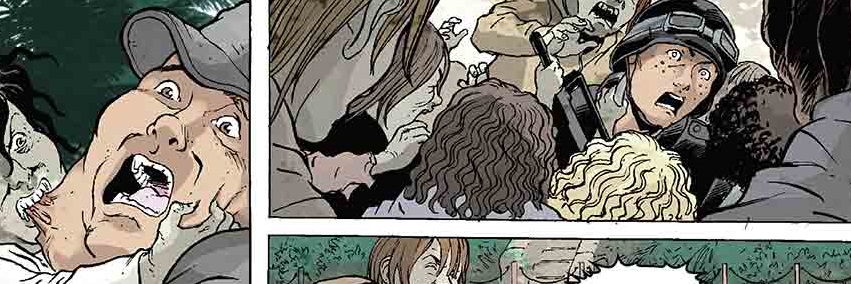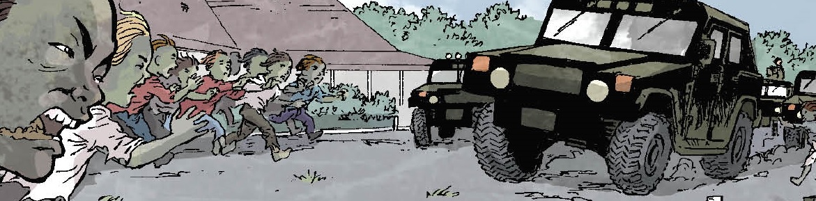 Being a comic it is probably a little easier to depict the killing of kids (even murderous zombie kids) however there is no skimping on the violence, be it a child ripping into a throat or a bunch of bullets tearing through the children, it is all there in its gory glory. Whilst a majority of the writing is perfunctory it does serve an absolute and positive purpose, being a familiar story to get you in and some of the dialogue reads like lines from a blockbuster further enhancing the movie/tv series feel that is established early on.There is, as you would expect, a very dark palette in terms of the colours used and there is a hell of a lot of shading, it works together well and is in keeping with the bleak story line. The zombie kids are frightening, looking like grey and vicious as they should.