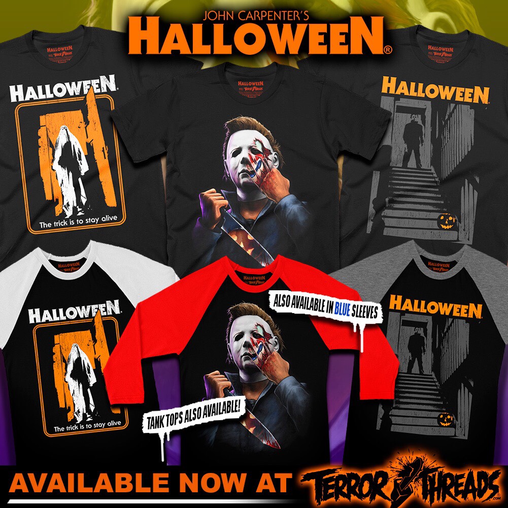 Terror Threads’ celebration of the 40th anniversary of John Carpenter’s Halloween continues with three new shirts featuring Michael Myers, bringing the company’s total Halloween designs to a whopping 19. They’re available on T-shirts, tank tops, and baseball tees.