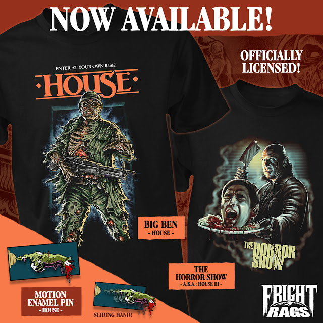 Enter Fright-Rags’ House collection at your own risk. Horror comes home on a tee with Big Ben from the ’80s cult classic, as well as a shirt for The Horror Show (also known as House III) and an enamel pin based on the House poster, which features a severed hand with sliding action.