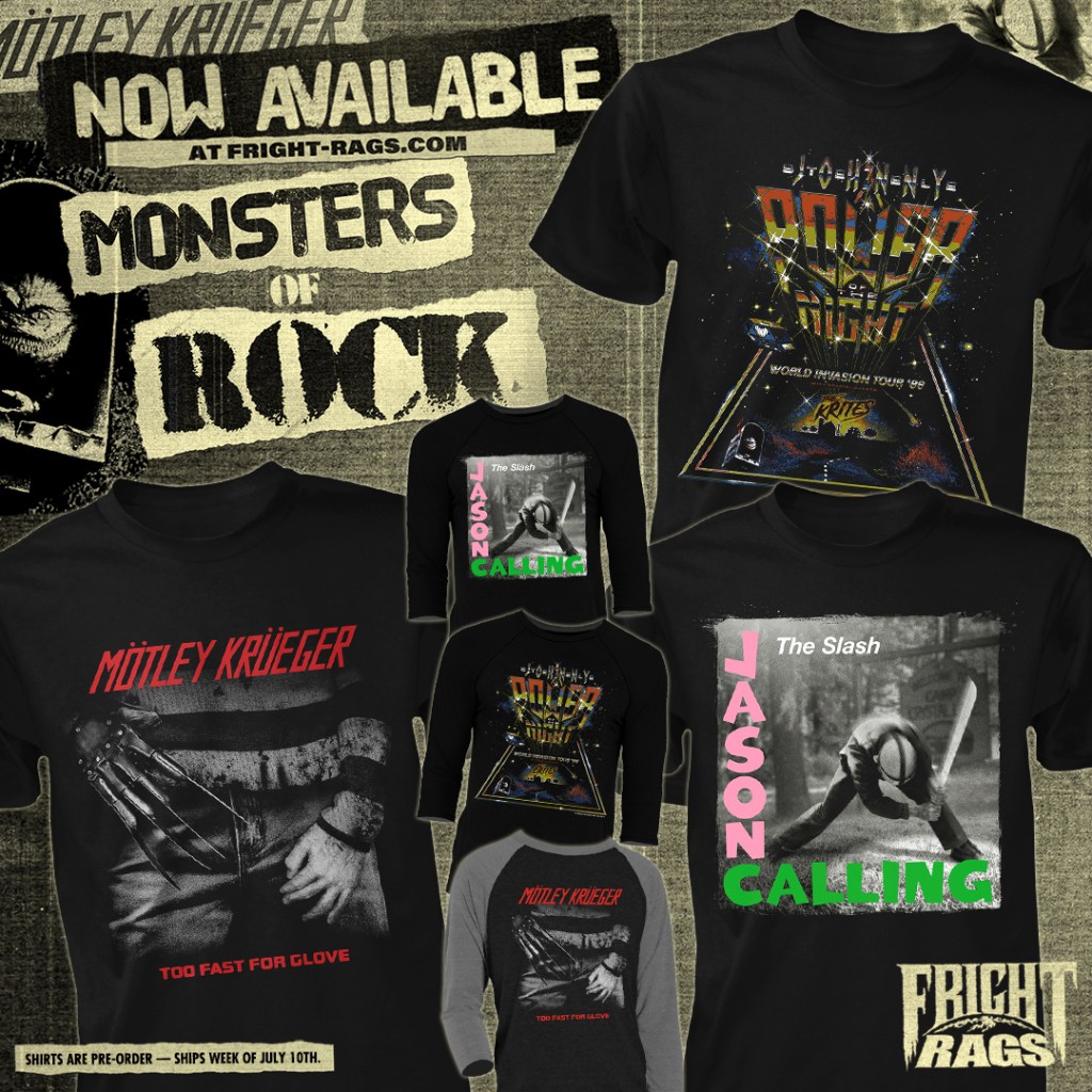 Fright-Rags has unleashed the monsters of rock: a Clash parody with Jason Voorhees, a Motley Crue parody with Freddy Krueger, and a tribute to Critters’ “Power of the Night.” Each design is available on T-shirts and baseball tees.