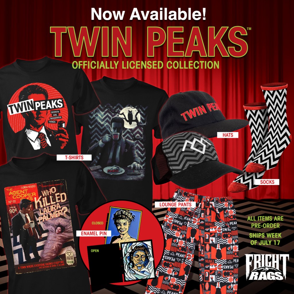 Fright-Rags welcomes you to Twin Peaks with apparel from David Lynch’s iconic series. It is happening again with three shirts, lounge pants, a Twin Peaks heritage hat, a Black Lodge trucker hat, Black Lodge socks, and a Laura Palmer flip-open enamel pin.