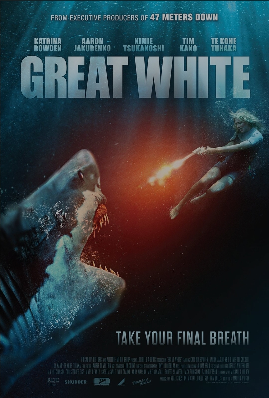 In GREAT WHITE, a blissful tourist trip turns into a nightmare when five seaplane passengers are stranded miles from shore. In a desperate bid for survival, the group try to make it to land before they either run out of supplies or are taken by a menacing terror lurking just beneath the surface.