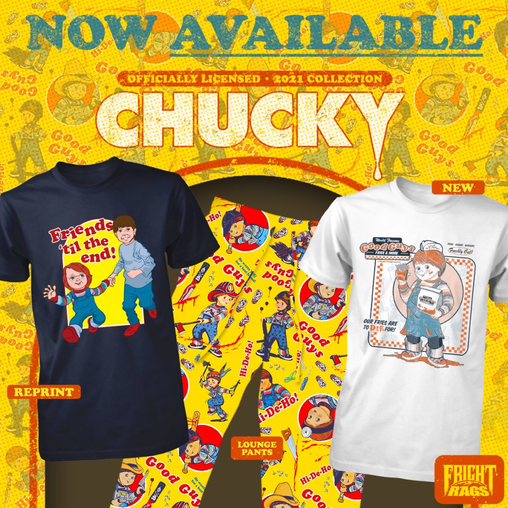 Be one of the Good Guys with Fright-Rags’ Chucky collection, which includes a new shirt to die for, a reprint of a classic Child’s Play design, and Good Guys lounge pants.