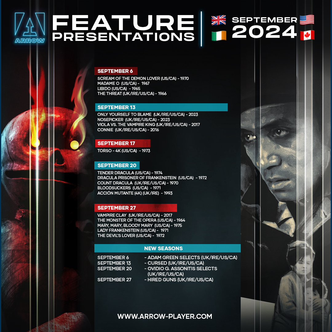 Arrow Video is excited to announce the September 2024 lineup of their subscription-based ARROW platform, available to subscribers in the US, Canada, the UK and Ireland. Enjoy a selection of new titles, from carefully cultivated curations to shorts by new talent to deep dives into the tastes of filmmakers that changed the way we see the genre.