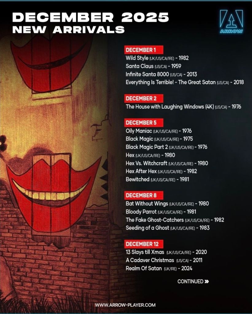 Arrow Video is excited to announce the December 2025 lineup of their subscription-based ARROW platform, available to subscribers in the US, Canada, the UK and Ireland. Enjoy a selection of new titles from carefully cultivated curations to rediscovered classics. For serious enthusiasts, ARROW offers deep dives into the tastes of filmmakers that changed the way we see the genre.